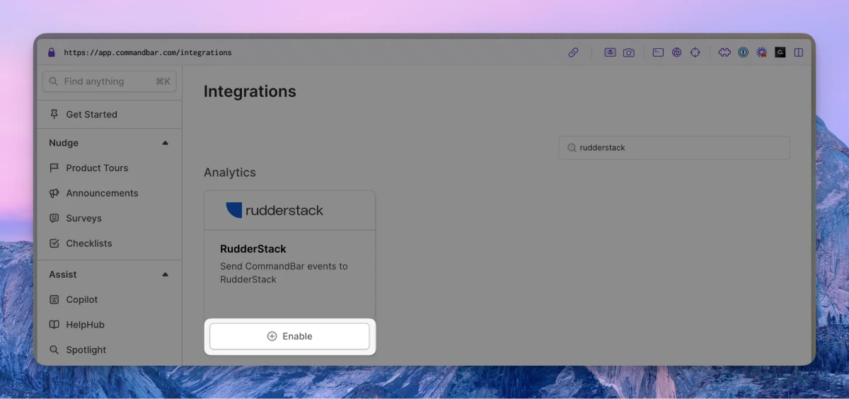 Navigate to /integrations and click Enable on the RudderStack integration card.