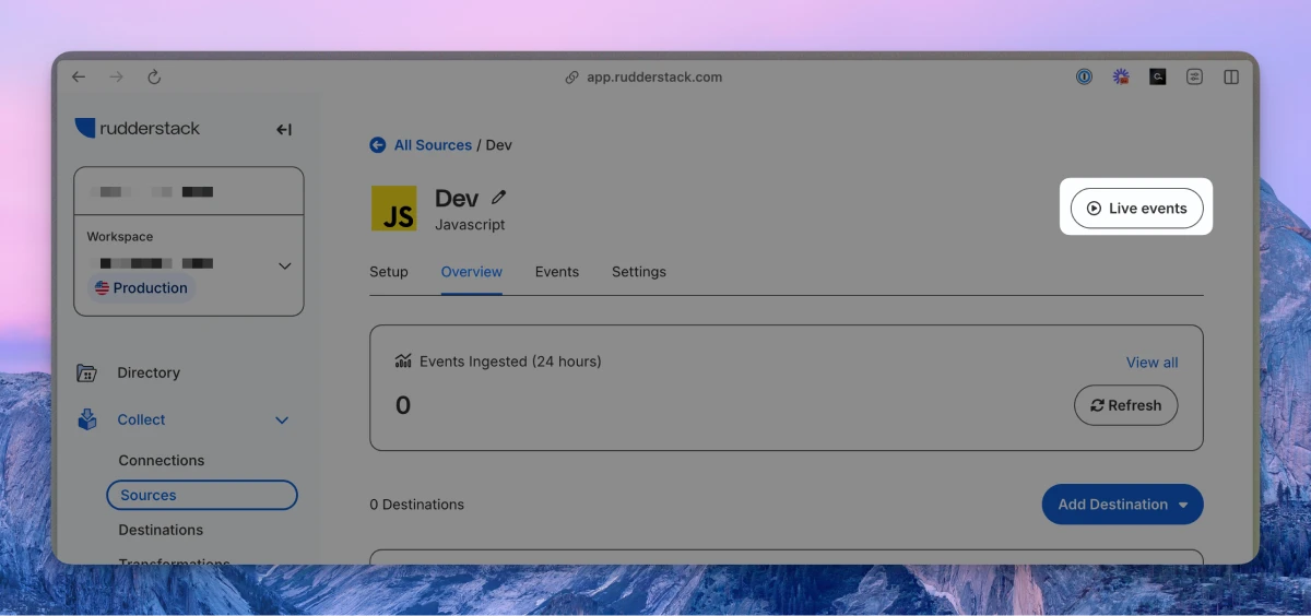 In RudderStack, click on “Sources”, then select the source that is used in your application