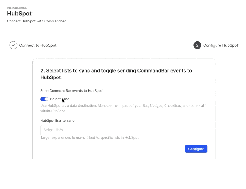 Listsfrom HubSpot you’ve created as well as send Command AI events to HubSpot. Here, you’ll also decide if you want to send Command AI events to HubSpot.