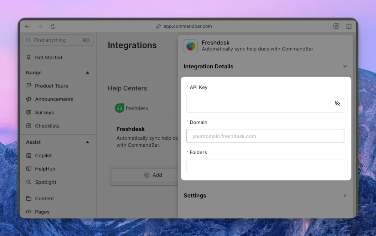 Go to Integrations. Click “Add” on the Freshdesk card.